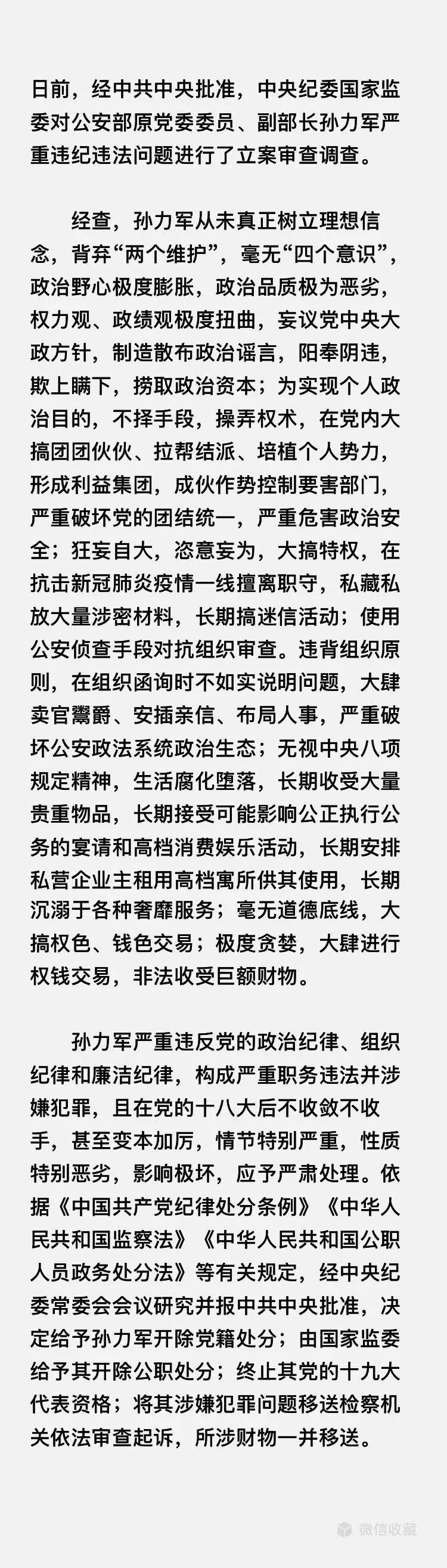 2021年9月30日,中央纪委国家监委对孙力军严重违纪违法问题进行了立案审查调查。——来源百度百科