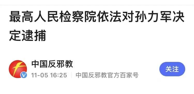 孙力军既然被审查、被双开,到今天被逮捕,说明其罪不轻。可以想见,在中国反邪教官方百家号眼里,孙力军虽不是邪教人物,却一定算得上一个很邪的人物,否则,国家对他的定性用词就不会极其严厉了。