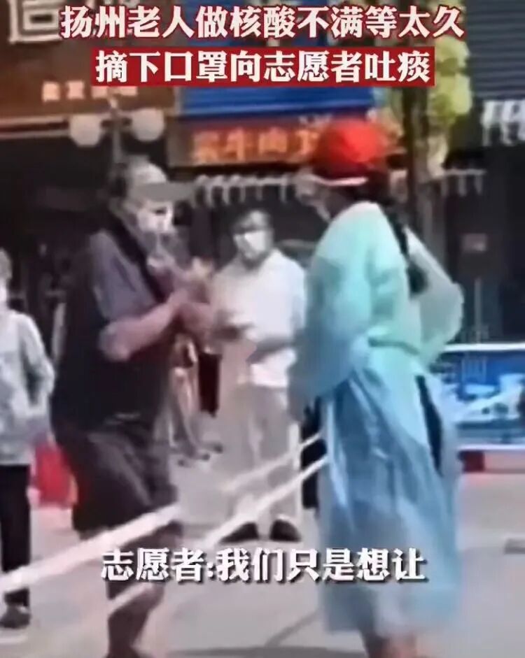 比如扬州疫情期间,一个扬州本地老头做核酸检测,因为等得太久,产生不满,就把气撒到最弱的一方,直接扒下口罩,向一个做志愿者的小姑娘身上吐痰。
