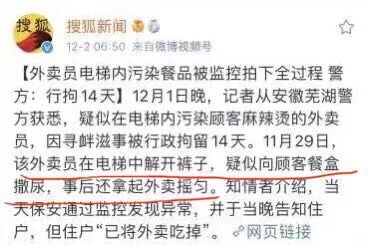丑行败露,12月1日晚,记者从安徽芜湖警方获悉,疑似在顾客麻辣烫中尿尿外卖员,因寻衅滋事被行政拘留14天
