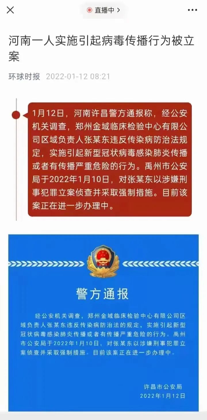 1月12日,河南许昌警方通报称,经公安机关调查,郑州金域临床检验中心有限公司区域负责人张某东违反传染病防治法规定,实施引起新型冠状病毒感染肺炎传播或者有传播严重危险的行为。禹州市公安局于2022年1月10日,对张某东以涉嫌刑事犯罪立案侦查并采取强制措施。