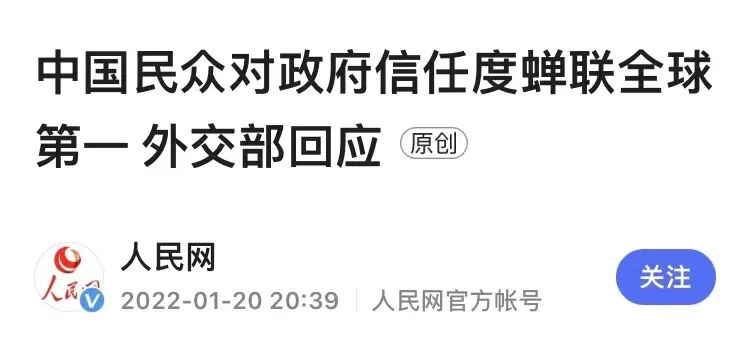 据人民网报道:中国民众对政府的信任度全球第一,达到91%。