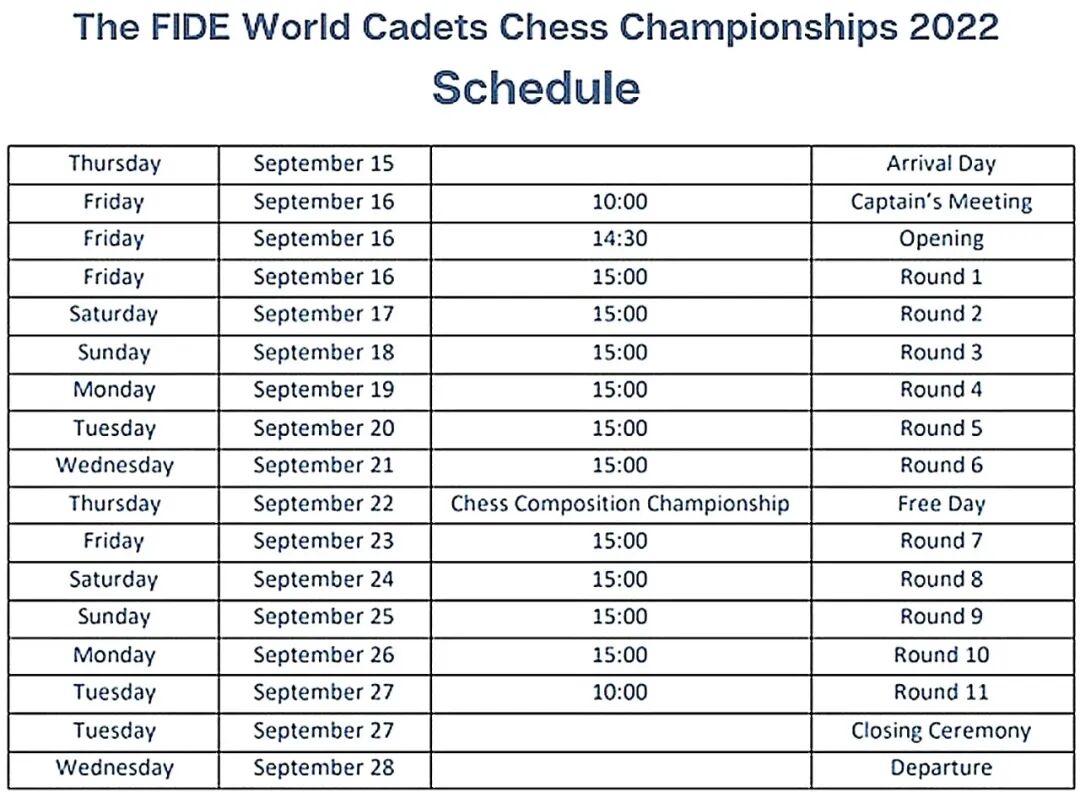 另外,根据国际棋联早先公布的赛事计划,2022国际棋联世少赛(U14-U18)将于9月5-18日在罗马尼亚的马马亚举行(★2022年国际象棋世界大赛日历)。
