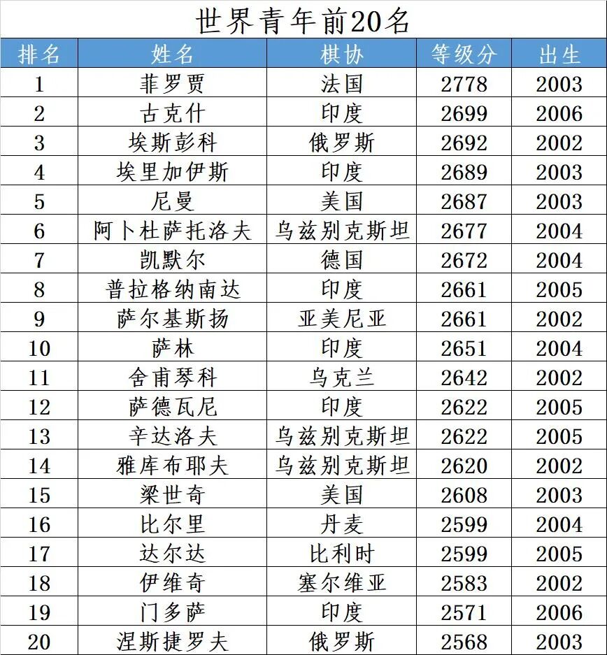 世界青年前20名(2022年6月)