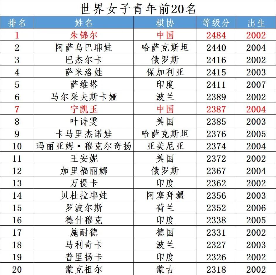 世界女子青年前20名(2022年9月)