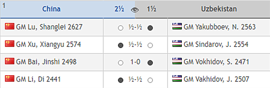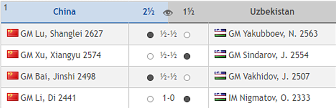 在国际棋联赛前进行了冠亚军预测投票中,有77.1%的人认为乌兹别克斯坦队将获得冠军。毕竟乌兹别克斯坦队贵为新科奥赛冠军。而眼前的这支中国队,除了队长温阳是曾经的世团赛冠军之外,其余四位棋手都是第一次亮相世界大赛。今天,中国队仍然是四位年轻棋手出战。队长温阳继续稳坐军中帐。首场比赛,中国队先声夺人,以2.5比1.5获胜。半决赛中有精彩发挥的三台白金石再立新功,在复杂的中局战斗中,弃兵弃子打开进攻线路,随后后车象连手攻王,精彩战胜沃希多夫。一台卢尚磊、二台许翔宇和四台李荻分别与对手弈和。![]()