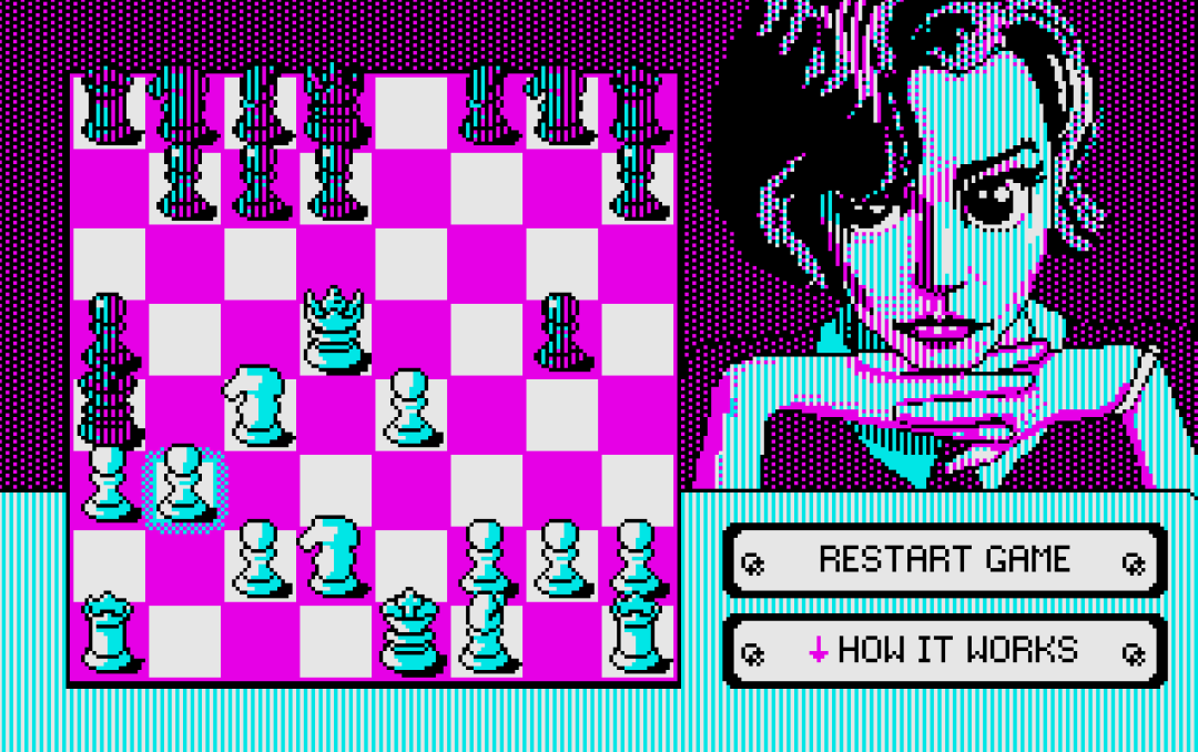 Kilobyte’s Gambit 的封面选用了 Netflix 热播剧《女王的棋局》中的女主角贝丝的形象,而且图形界面为 MS-Dos 风格,颇具年代感。