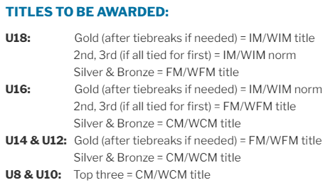 北美青少年锦标赛是一项国际赛事,将计算国际棋联等级分和美国棋协等级分。比赛为9轮瑞士制,时限为每方90分钟,每步棋加30秒。各组别前3名得主可获得国际棋联称号或序分,每组优胜者也将获得奖杯。棋手可通过比赛官网在线报名。