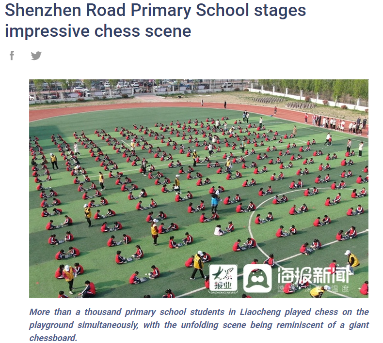 编者按:国际棋联一直非常关注国际象棋在校园的推广和普及。日前,聊城高新区深圳路小学举办了第二届“良知杯”国际象棋比赛,该学校一、二、三年级的千余名学生在操场席地对弈,场面非常壮观。国际棋联在官网进行了全文报道。