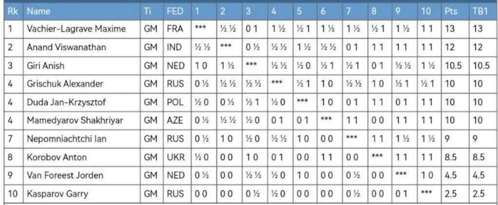在双循环的超快棋赛中,瓦谢尔·拉格拉夫成绩最好,18盘棋9胜8和1负积13分。阿南德和吉里分别以12分和10.5分排在第二和第三。