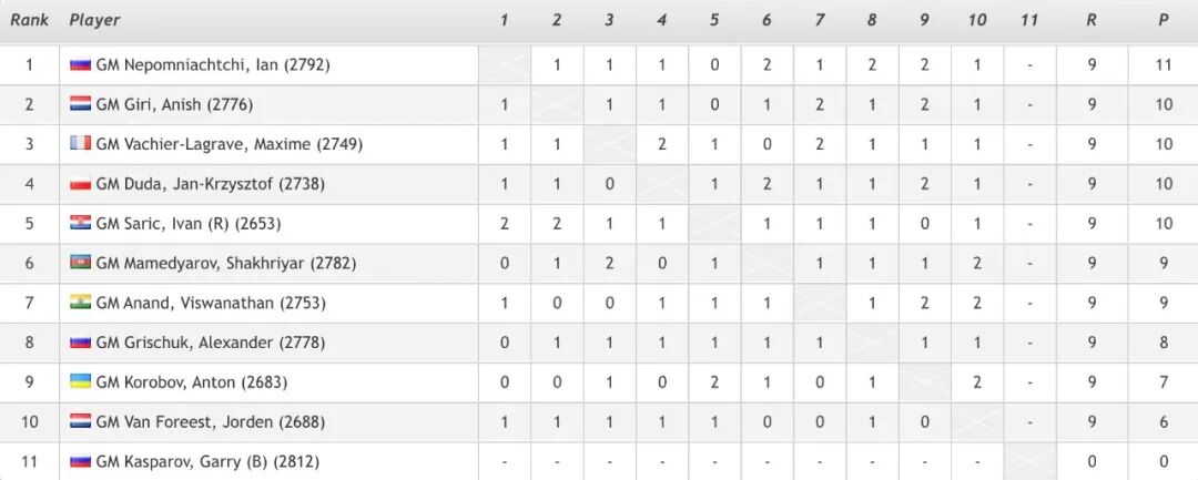 卡斯帕罗夫上一次亮相计算等级分的赛事,是在2017年超巡赛圣路易斯站,虽然只获第八名,但还是能与顶尖高手抗衡的(★英雄或迟暮 魅力恒久远)。