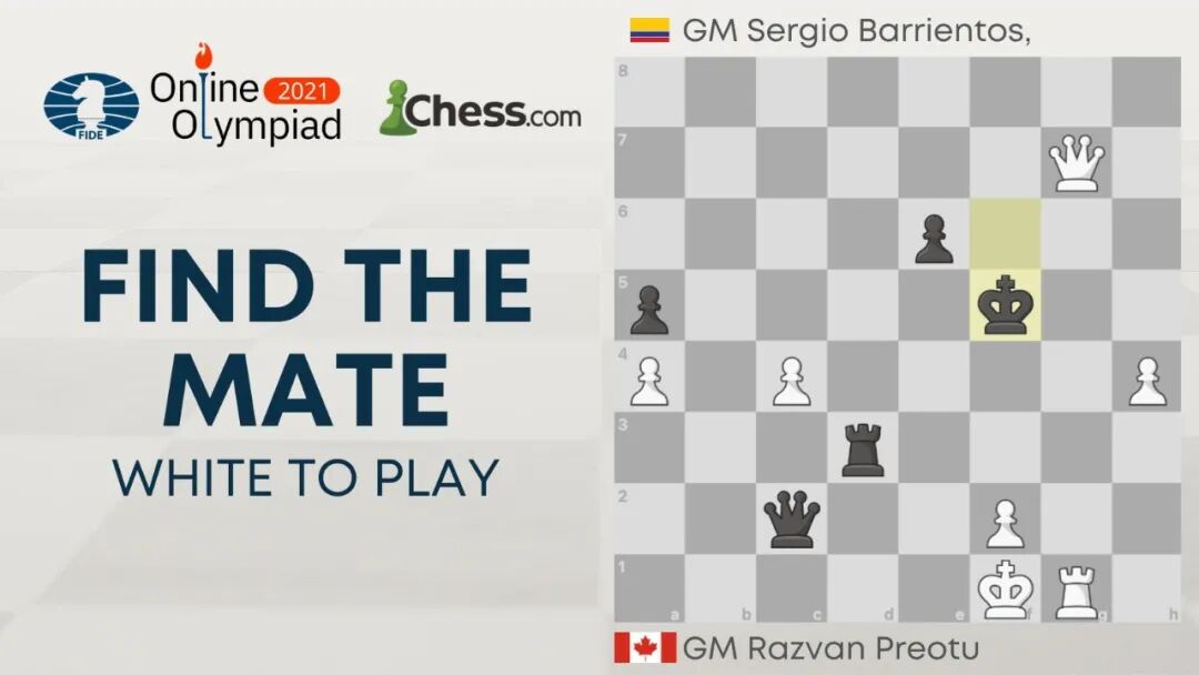 第①题:顶区D组第二轮,加拿大队二台执白战胜对手,为本队3.5比2.5战胜哥伦比亚队,拿下关键一分。上图中,特级大师Preotu有杀棋。
