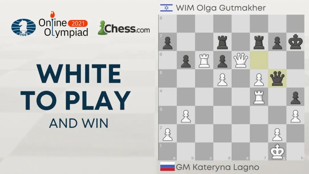 第①题:顶区C组第五轮,卫冕冠军俄罗斯队5比1大胜以色列队。世界亚军拉戈诺上图局面中抓住对手29...Qg5?的失误,一举获胜。