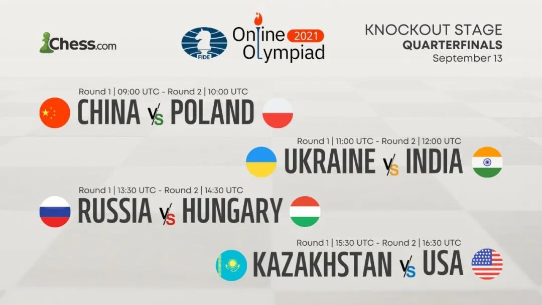下半区的两场比赛,都没有出现加赛。中国队和俄罗斯队均直落两场,顺利晋级。上半区的两场比赛,都进行到了超快棋加赛,印度队和美国队凭借加赛胜出,会师半决赛。