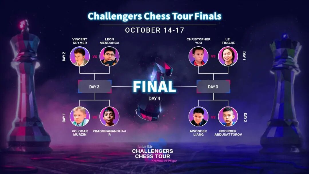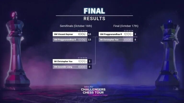 由挪威 Play Magnus 集团赞助举办 Julius Baer 挑战者巡回赛总决赛北京时间10月18日凌晨在chess24平台全部结束。16岁的印度神童普拉格纳南达在决赛中直落三盘,战胜美国韩裔棋手 Christopher Yoo,获得总决赛冠军。