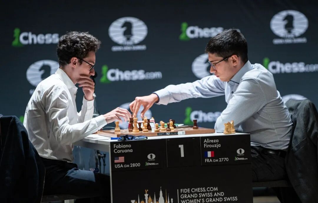 2021国际棋联大瑞士制赛第九轮,美国名将卡鲁阿纳执白力克积分领跑的18岁神童菲罗贾。