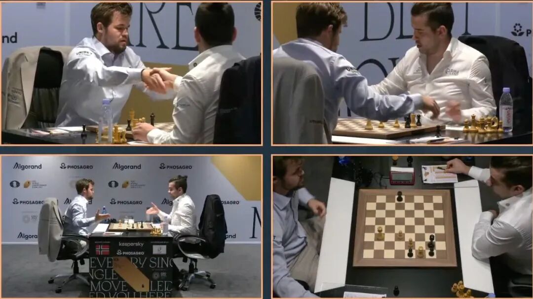 这盘棋,卫冕冠军卡尔森以后兵起步。有意思的是,在开棋仪式上,卡尔森告诉国际棋联主席德沃尔科维奇用王兵起步。正式开赛的时候,卡尔森却选择了后兵。