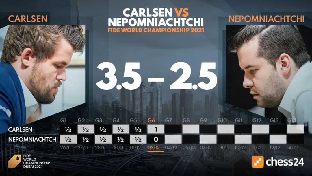 北京时间12月4日凌晨,在阿联酋迪拜展览中心进行的2021国际象棋世界冠军赛结束了第六盘棋的争夺。经过接近八小时总共136回合的鏖战,卫冕冠军卡尔森执白战胜挑战者涅波姆尼亚奇。目前卡尔森以3.5比2.5取得领先。本局也成为国际象棋世界冠军赛历史上回合数最多的一盘棋。
