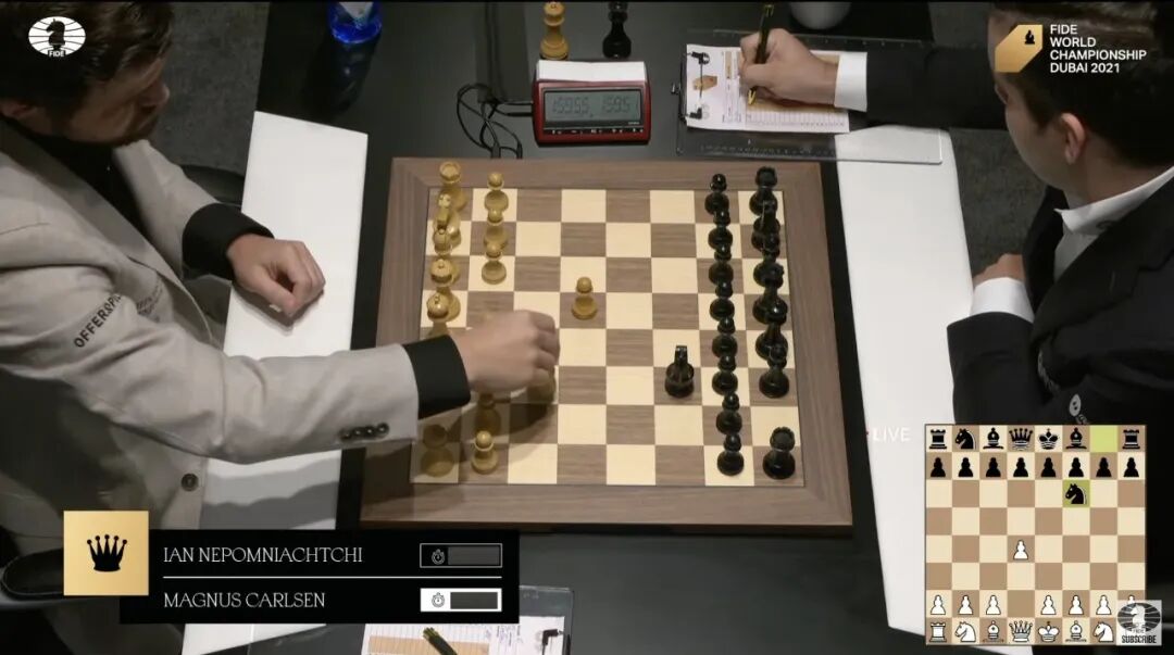 这样,经过7小时45分钟的不懈努力,卫冕冠军卡尔森将坚冰凿破,取得领先。值得一提的是,这盘棋超越1978年卡尔波夫-科尔奇诺依世界冠军赛第5盘(124回合),成为国际象棋世界冠军赛历史上回合数最多的一盘棋。