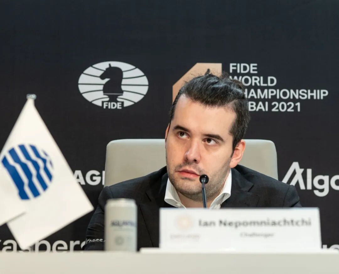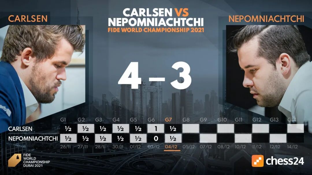 北京时间12月4日晚,在阿联酋迪拜展览中心进行的2021国际象棋世界冠军赛战罢第七盘。经过不到三小时的争夺,挑战者涅波姆尼亚奇执白弈和卫冕冠军卡尔森。目前,世界冠军赛半程结束,卡尔森以4比3领先。