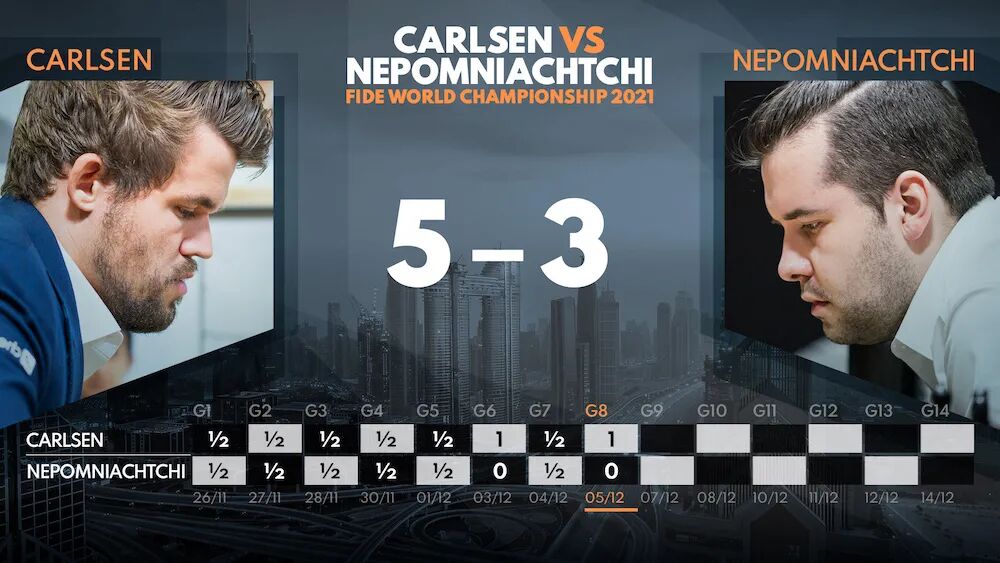 北京时间12月6日凌晨,在阿联酋迪拜进行的2021国际象棋世界冠军赛结束了第八盘棋的争夺。积分领先的卫冕冠军卡尔森执白战胜挑战者涅波姆尼亚奇,迎来对抗赛的第二场胜利,目前卡尔森以5比3领先,卫冕前景光明。