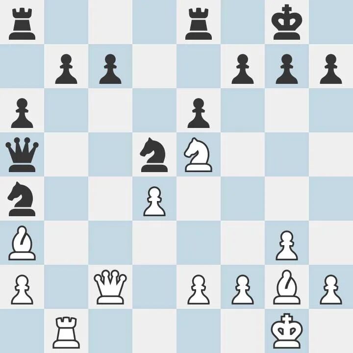 又是惊世骇俗的一招棋,卡尔森放弃双象,用最直接的子力兑换攻破黑方后翼防守。但白方如能走:20.Be4!g6 21.Bxd5 exd5 22 Bb4!Qb6 23.Bc3 Qxb1+ 24.Qxb1 Nxc3 25.Qxb7 Nxe2+ 26.Kg2 Nxd4 27.Qxc7 ,白方于第20回合中通过巧妙的走子顺序削弱黑方王城的效果在此时得以展现,白后和马可以充分利用黑方黑格的弱点获得胜势。