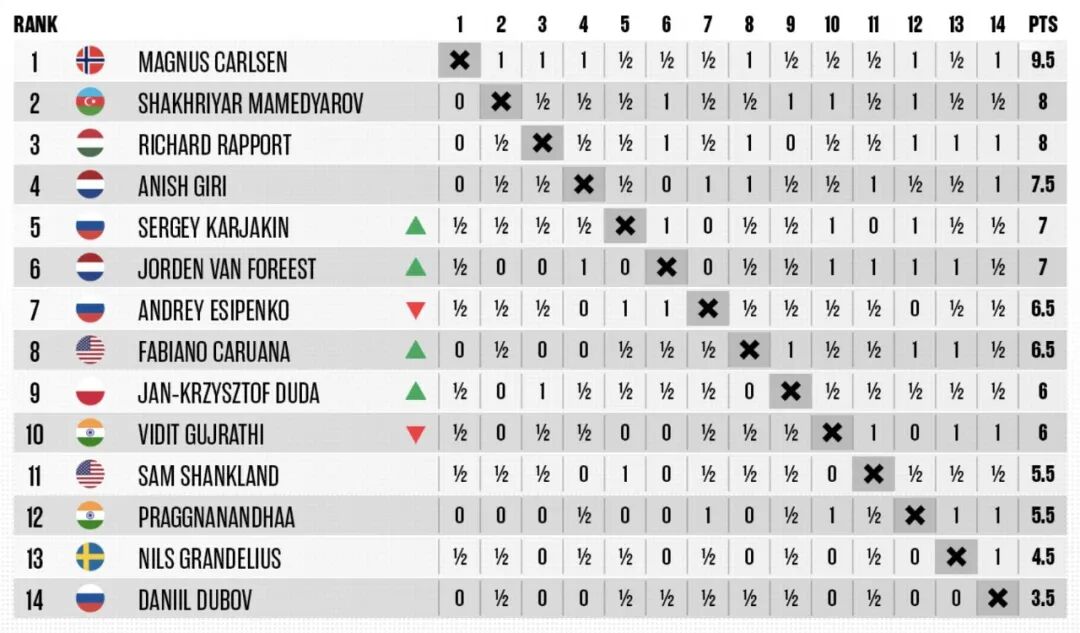 整场比赛,除最后一轮不战而胜(编注:俄罗斯棋手杜波夫感染新冠,10轮后被迫退赛)之外,卡尔森相继战胜了吉里、拉波尔特、普拉格纳南达、马梅季亚洛夫和卡鲁阿纳。而且,前12轮比赛,卡尔森有7盘后手棋,5盘先手棋,这样的发挥令人印象深刻。