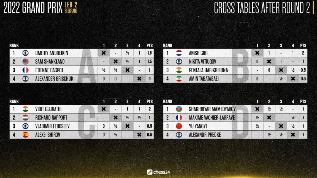 其中,B组的荷兰棋手吉里和C组的印度棋手维迪特延续强势,取得两连胜。吉里凭借意大利开局,仅32回合拿下俄罗斯棋手维秋戈夫。维迪特则执白经过53回合战斗,击败俄罗斯棋手费多谢耶夫。A组的美国棋手尚克兰执白战胜了俄罗斯名将格里修克。修克遗憾两连败。