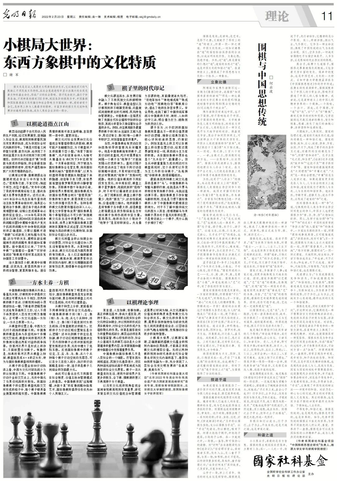 小棋局大世界,以棋理论事理,正确理解把握棋文化蕴含的规则内涵和应用场景,才能真正体现棋文化的博弈价值。无须以两种棋的规则和所代表的古代社会背景去评判文化内涵的高下,差异性和同质性融为一体,充分体现了人类社会历史文明发展的“各美其美、美美与共”。