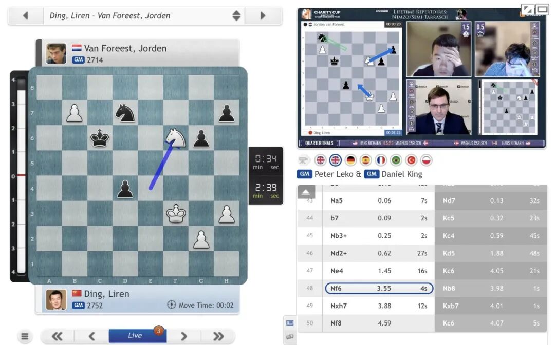 第一盘丁立人执白先行旗开得胜,中局凭借战术打击轻松获得优势后,最终转入车兵残局赢得胜利。第二盘战至车象兵残局,执黑的丁立人一度有胜势,但最终被对手守和。第三盘,两人战至均势的马兵残局后,弗雷斯特出现失误,让丁立人再下一城,提前一盘结束战斗。
