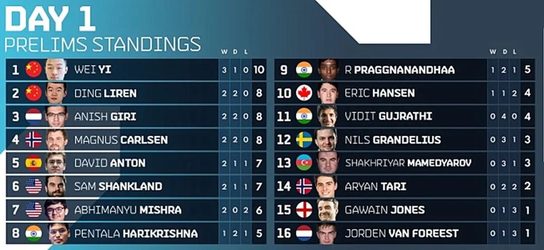在预赛首日的四轮比赛中,中国棋手韦奕成绩最好,以3胜1和积10分独自领跑积分榜。韦奕在首轮弈和印度希望之星普拉格纳南达之后,第2-4轮连胜印度棋手哈里克里什纳、英国特级大师琼斯和西班牙全国冠军安东·奎亚罗。