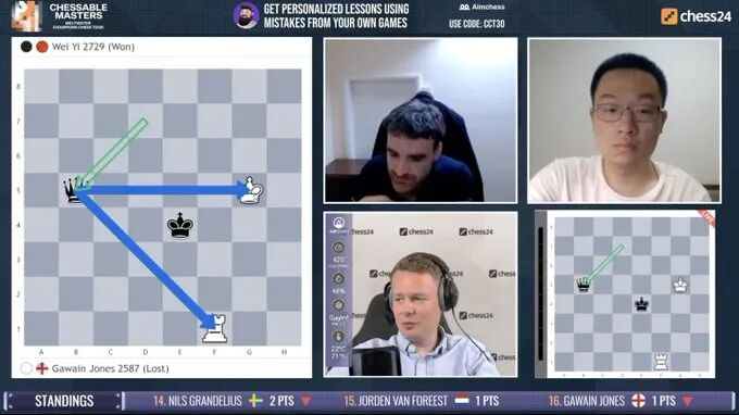北京时间5月19日晚,2022Meltwater冠军网络巡回赛第四站比赛 - chessable 大师赛在chess24平台开战。在预赛首日比赛中,两位中国棋手韦奕和丁立人发挥出色,暂列积分榜前两位。