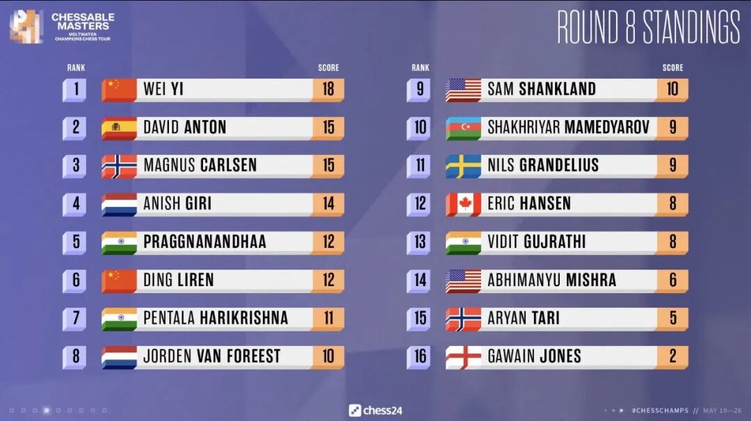 北京时间5月21日凌晨,在chess24平台进行的chessable大师赛结束了预赛第二天的比赛。中国棋手韦奕以5胜3和积18分继续领跑。丁立人以2胜6和积12分,暂列第六位。