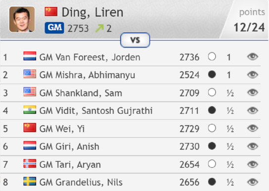 丁立人预赛第二天的四盘棋全部弈和。第五轮战平韦奕后,后面三轮丁立人相继弈和荷兰棋手吉里、挪威棋手塔里和瑞典棋手格兰德柳斯。目前丁立人以2胜6和积12分,他与普拉格纳南达同积12分,并列积分榜第5-6位。
