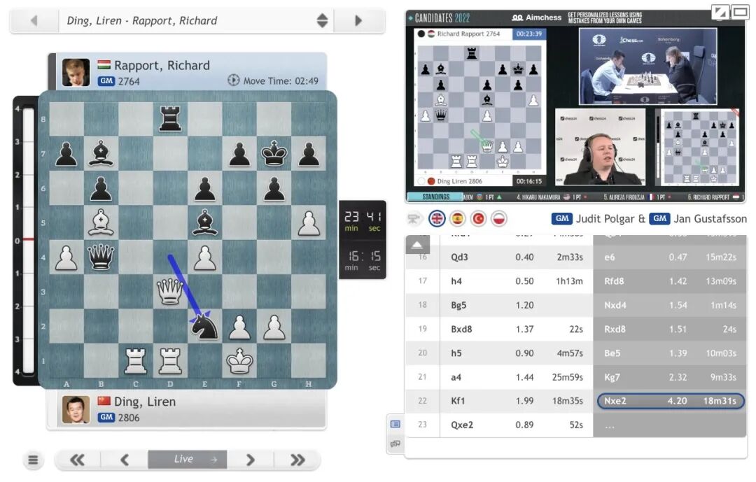 值得一提的是,今天在第22回合,面对拉波尔特咄咄逼人的攻击,丁立人走出了非常精确但“看起来超级怪异的”等着 22.Kf1,让讲棋嘉宾国际大师 Rensch 惊呼“丁立人更像是机器人!”