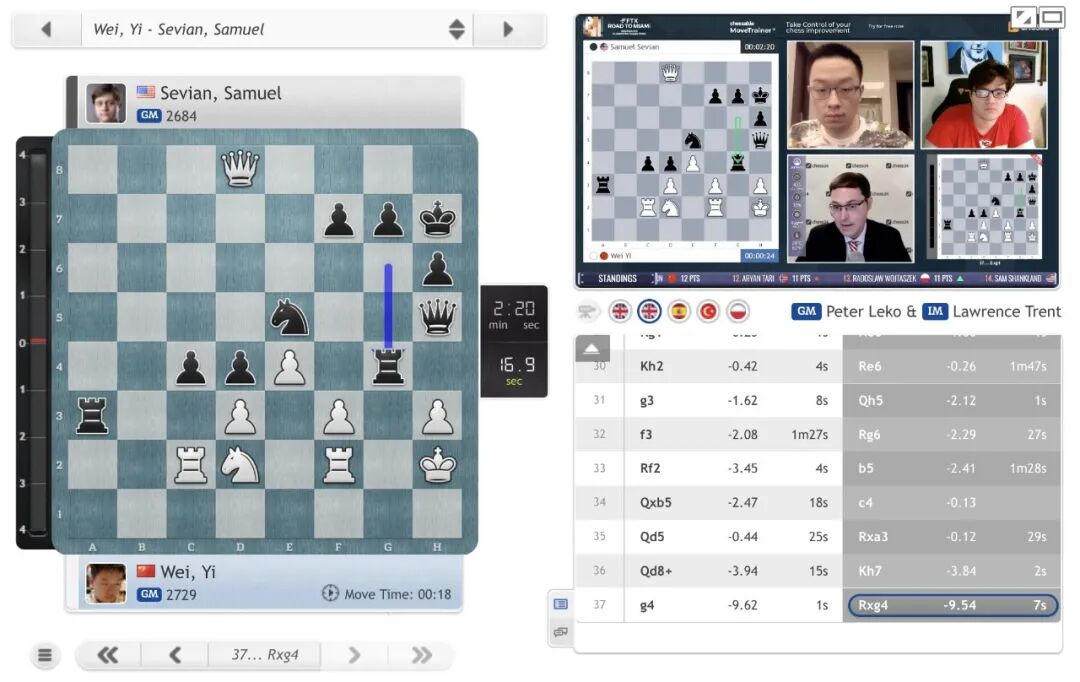 在凌晨1-5点作战的两位中国棋手韦奕和居文君目前分别积15分和12分,暂列积分榜第9和第12位。韦奕在第9-12轮取得3和1负,他相继战平了荷兰棋手吉里、美国棋手熊奕韬和挪威棋手塔里,第13轮输给了领头羊塞维扬。昨天表现抢眼的世界棋后居文君在9-12轮遭遇连败。其中在第9轮与美国棋手多明格斯的战斗中,居文君一度形势不错,但最终被多明格斯逆转。