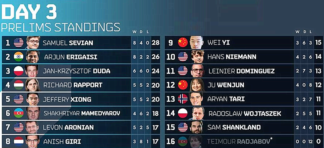 在chess24平台进行的2022Meltwater冠军网络巡回赛第五站比赛 - “FTX 迈阿密之路锦标赛”北京时间7月13日凌晨结束了预赛第三天的四轮比赛。美国棋手塞维扬延续强势继续领跑。两位中国棋手韦奕和居文君暂列积分榜第9和12位。