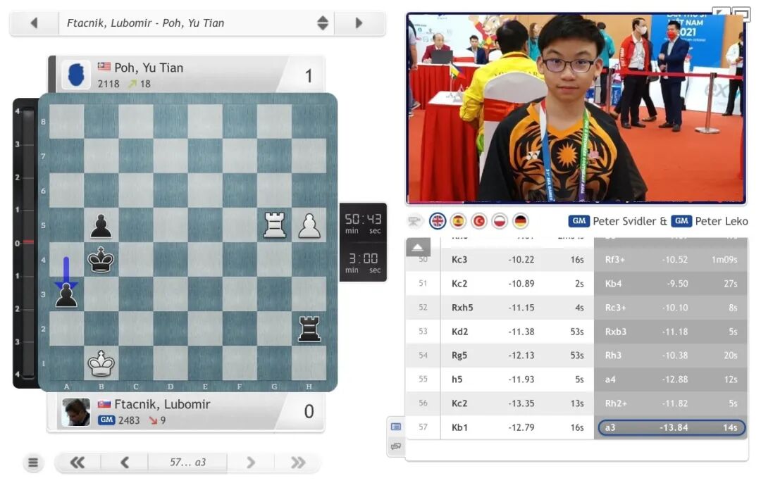 另一个冷门来自13岁的马来西亚棋手Poh, Yu Tian(2118),他执黑力克65岁的斯洛伐克特级大师弗塔契尼克(2483),帮助本队以2比2打平斯洛伐克队。