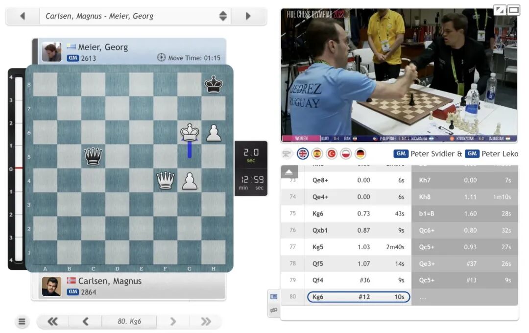 其中,世界冠军卡尔森本轮首次出场,率领挪威男队以4比0大胜乌拉圭队。卡尔森展示了深厚的残局功力,执白经过80回合战斗拿下去年年底转入乌拉圭棋协并入籍乌拉圭的前德国特级大师梅耶尔。