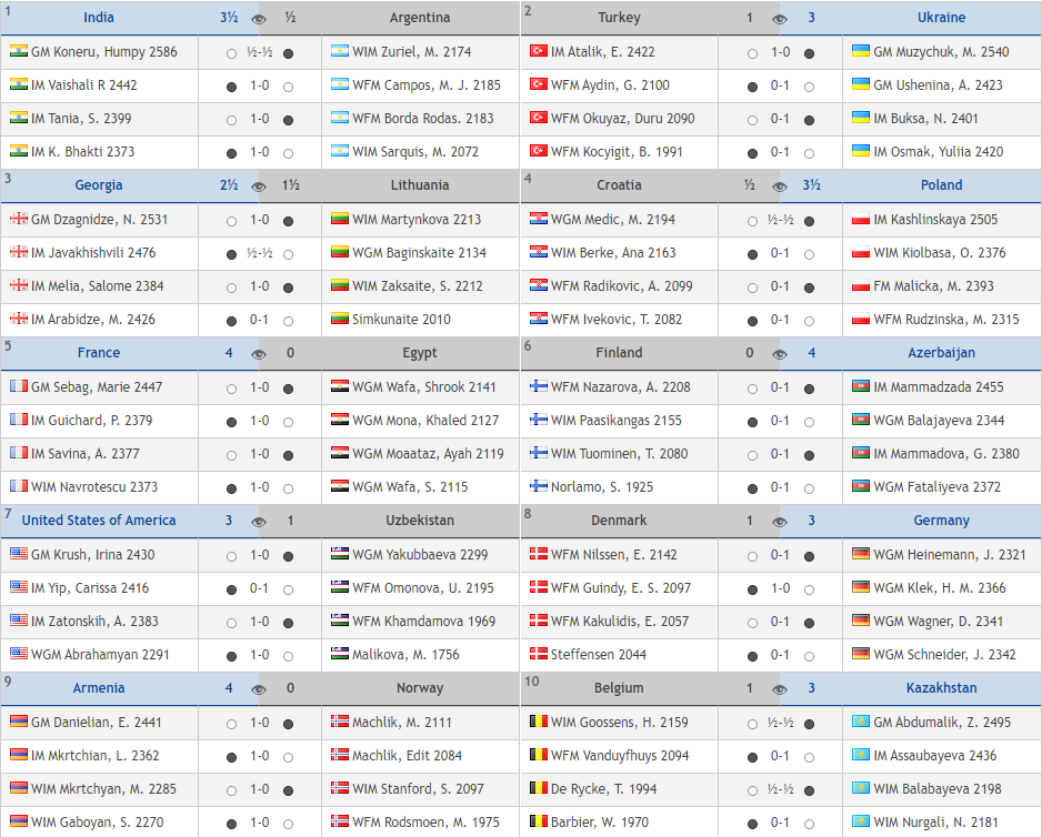 其中,头号种子印度一队以3.5比0.5战胜阿根廷队。不过名将科内鲁(2586)出人意料地被祖里埃尔(2174)顶和。