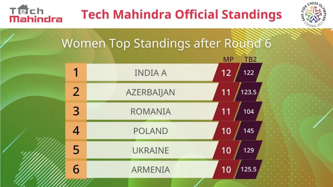 北京时间8月3日晚,在印度钦奈马哈巴利普兰进行的第44届国际象棋奥林匹克团体赛结束了第六轮比赛。公开组中,亚美尼亚队以2.5比1.5力克神童担纲的印度二队,以六连胜获得半程冠军。女子组中,印度一队3比1击败格鲁吉亚队,同以六连胜独自领跑。