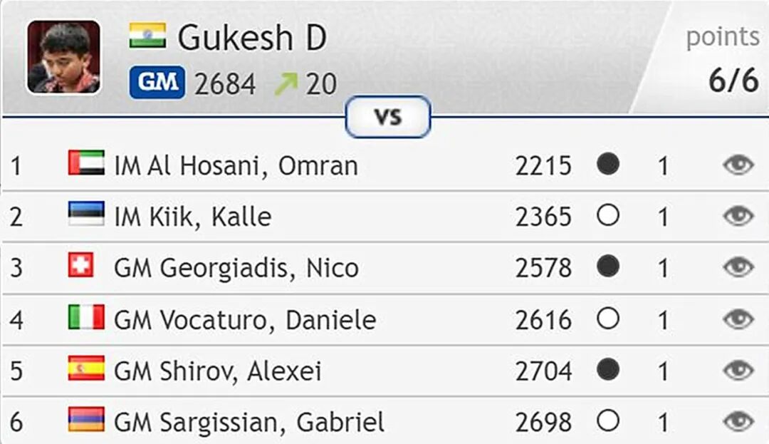 印度二队虽然首尝败绩,但坐镇一台的16岁古克什前六轮六连胜,是全场表现最好的棋手,实时等级分升至2719.3分,排名升至世界第26位!
