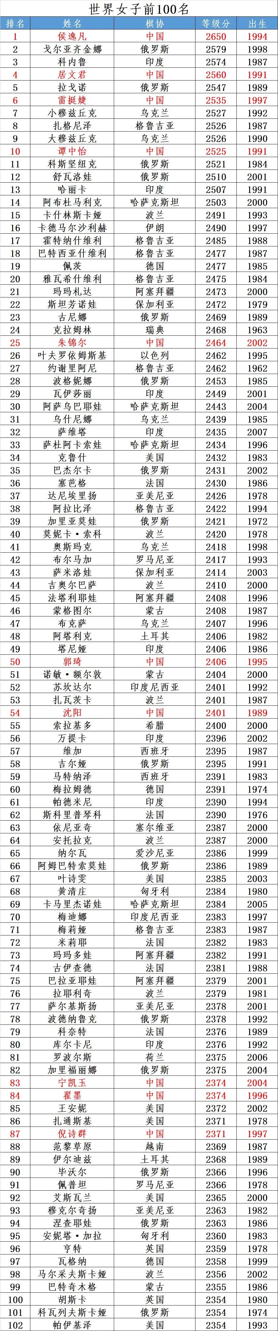世界女子前100名(2022年6月)