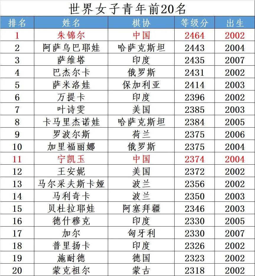 世界女子青年前20名(2022年8月)