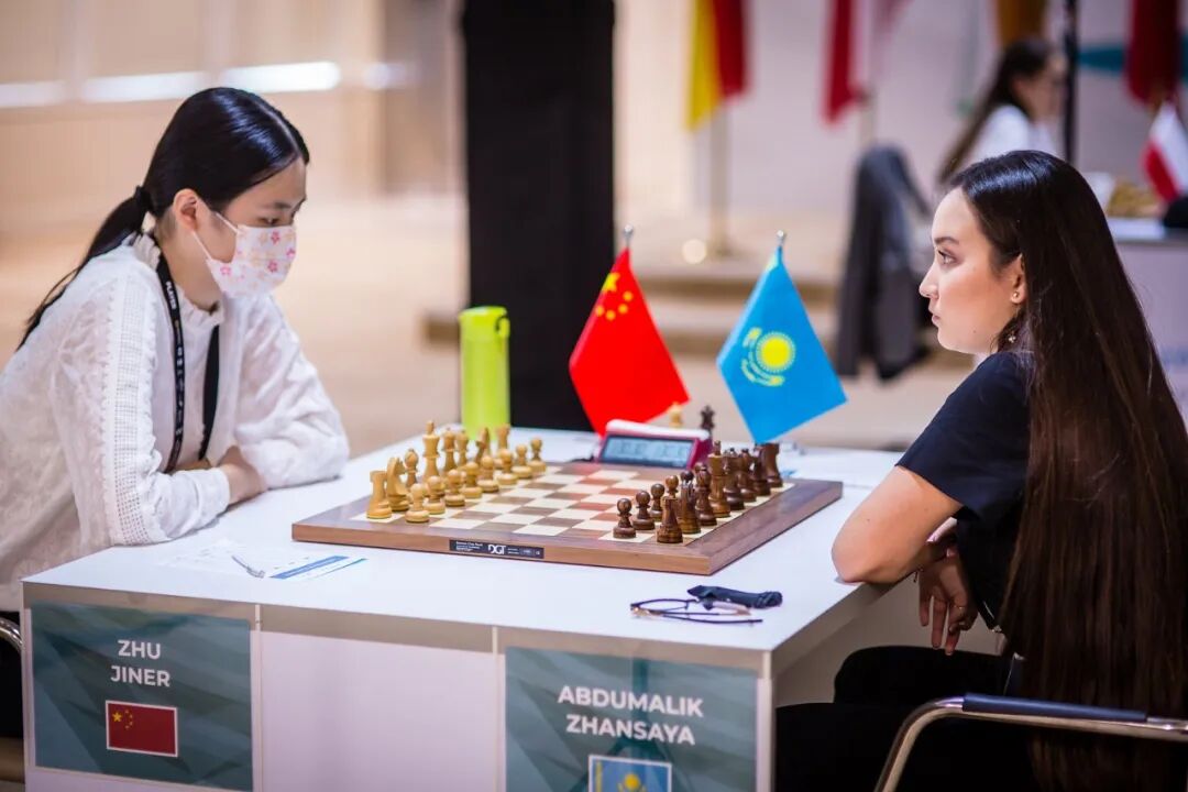 朱锦尔本轮执白迎来东道主头号女棋手阿布杜马利克。这盘棋是两人第一次慢棋交手。在复杂激烈的西西里防御中,执黑的阿布杜马利克在开局过后集结重兵,气势汹汹地向白方王城发起攻击。朱锦尔则冷静耐心地在中心和后翼寻求反击。