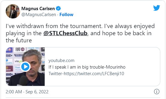 卡尔森退赛,没明确说明理由。他还发布了一则推文,推文中配上了耐人寻味的穆里尼奥的视频,标题为“如果我说话,就有大麻烦了”。