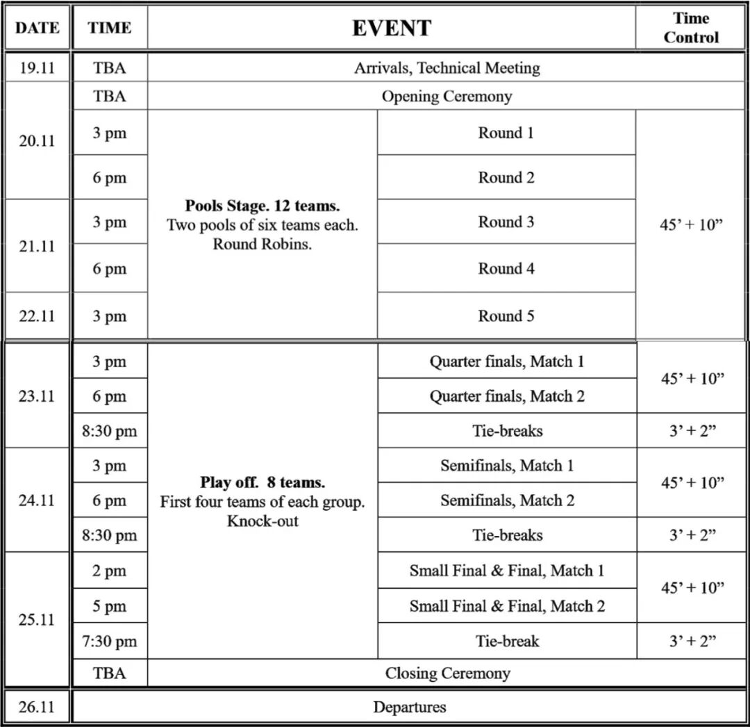 和往届比赛相比,本届世团赛有重大改变。以往的慢棋赛改为快棋赛,时限为每方45分钟,每步棋加10秒。赛制也从原来的单循环赛改为“分组+淘汰”赛制。按照日程按排,11月20-22日,12支队伍分成两组,每组6支队伍进行单循环赛。每组前四名进入淘汰赛阶段。中国队被分在A组,同组的还有法国队、荷兰队、南非队、西班牙队和乌克兰队。B组的六支队伍分别是:阿塞拜疆队、印度队、以色列队、波兰队、美国队和乌兹别克斯坦队。淘汰赛将于11月23-25日举行。每轮比赛交战双方分先进行两场比赛,胜者晋级。如果打平,则加赛超快棋(每方3分钟,每步棋加2秒)。中国男队在以往的世团赛中有着美好的记忆。2015年和2017年,中国男队两次夺冠。2005年、2011年和2013年,三次获得亚军。2019年获得第三名。本届比赛由国际棋联和以色列棋协主办,得到了以色列体育和文化部的大力支持。比赛将在耶路撒冷 Dan Hotel 举办。前世界冠军阿南德和七届法国女子全国冠军斯科里普琴科将为大家进行直播讲解。点按“阅读原文”,可观看棋谱直播。