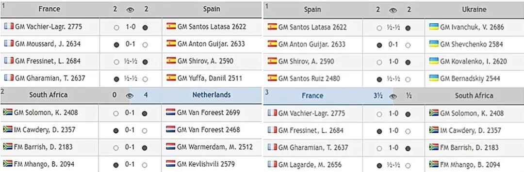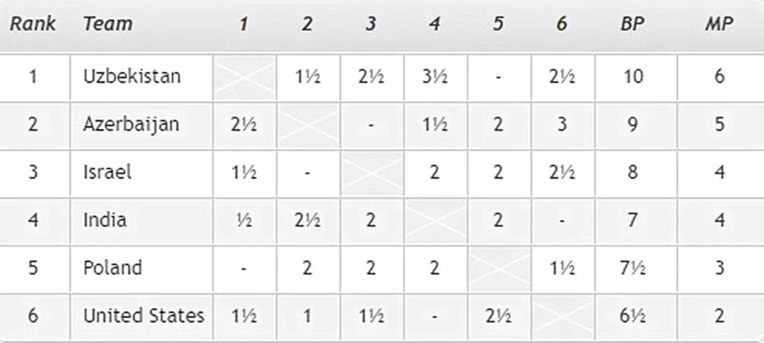 四轮过后,中国队四连胜,场分8分高居榜首。法国队和乌克兰队场分同积5分。西班牙队场分4分。荷兰和南非场分分别为2分和0分,基本出线无望。B组比赛中,首日发挥欠佳的奥赛冠军乌兹别克斯坦队今天找到节奏,今天连胜美国队和印度队,以场分6分,升至积分榜榜首。其中在第四轮,他们以3.5比0.5大胜印度队,多少有些令人意外。前两轮连胜的阿塞拜疆队今天发挥一般,第三轮输给印度队后,第四轮打平波兰。目前以场分5分,暂列小组第二。以色列队和印度队场分同积4分。波兰队仍然难求一胜,今天两连平后,场分暂积3分。今天遭遇两连败的美国队,场分2分,出线前景渺茫。![]()