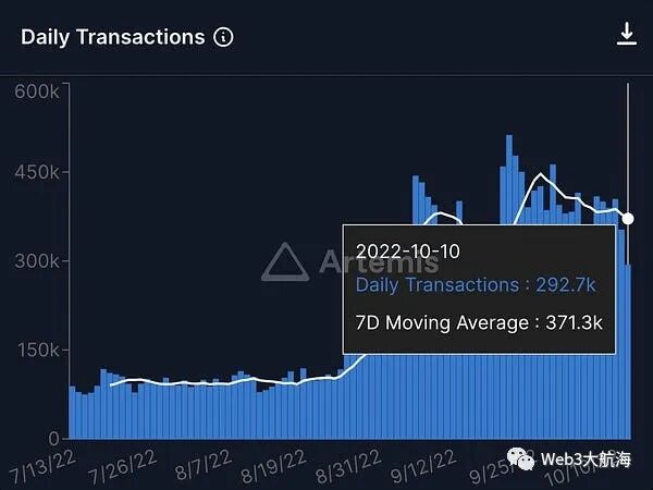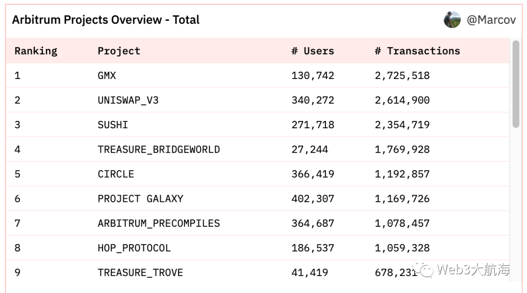 除了特定于应用程序的汇总之外,Optimistic Rollup 是第一个看到大量用户从 L1 桥接资金的通用汇总。它们是人们第一次真正有机会获得以太坊的安全保证,而无需支付高昂的 gas 费。Arbitrum 已经发布了他们的旗舰升级产品:Nitro。截至 2022年10月,他们在任何通用 Rollup 中获得了最多的采用。尽管出现了熊市,但他们的每日交易量已达到 4 倍,每日独立交易量翻了一番。以下是 Arbitrum 上交易最多的项目的排名。关于 Arbitrum 的另外两件重要的事情需要注意:• Arbitrum Nova是 Arbitrum 提供的产品套件的补充。一个非常适合游戏和社交应用程序的新链。Reddit 的社区积分将存在于 Arbitrum Nova 上。