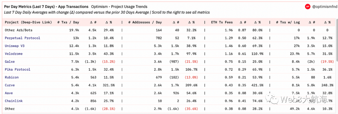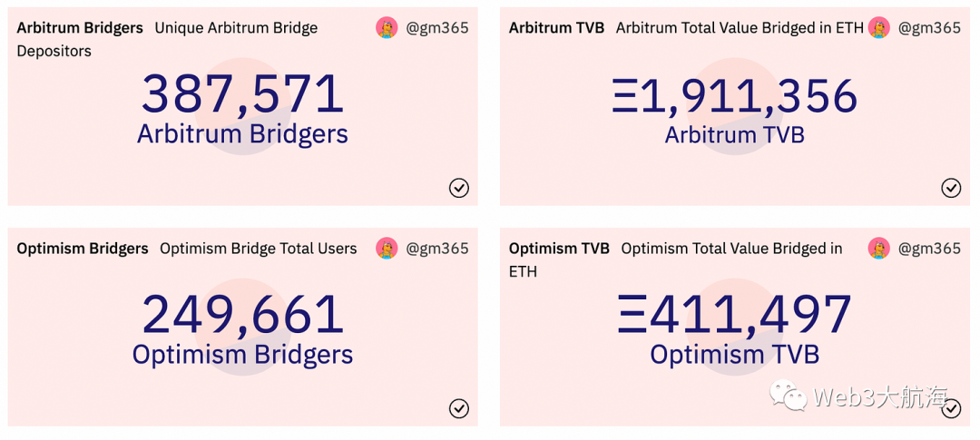 在排名前 10 的链中,只有 Arbitrum 和 Optimism 的 TVL 有所增加。在2021的过程中,我们有相当数量的用户已经桥接到 L2。这些是 Arbitrum、Optimism、zkSync 和 StarkNet 的统计数据。然而,尽管技术取得了进步,但如果我们持批评态度并以与以太坊相比的活动来查看两个最主要的Rollups,那么两个 L2 仍有一段路要走。尽管 Arbitrum 和 Optimism 提供的费用和速度较低,但在日常活动或日常交易中并未超过以太坊。如下是 L2 目前在采用方面的高级数据快照。